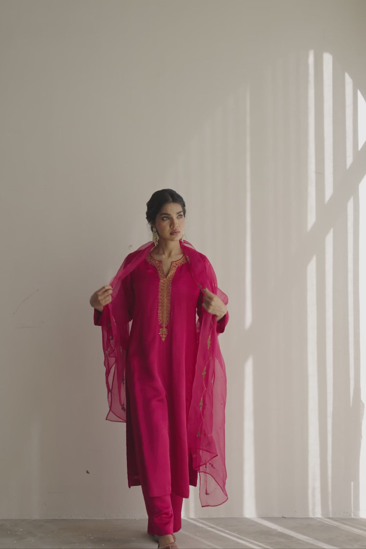 Silk kurta featuring hand embroidery on the neckline, paired with straight velvet pants and Sitara Odhani for a classic, refined silhouette.