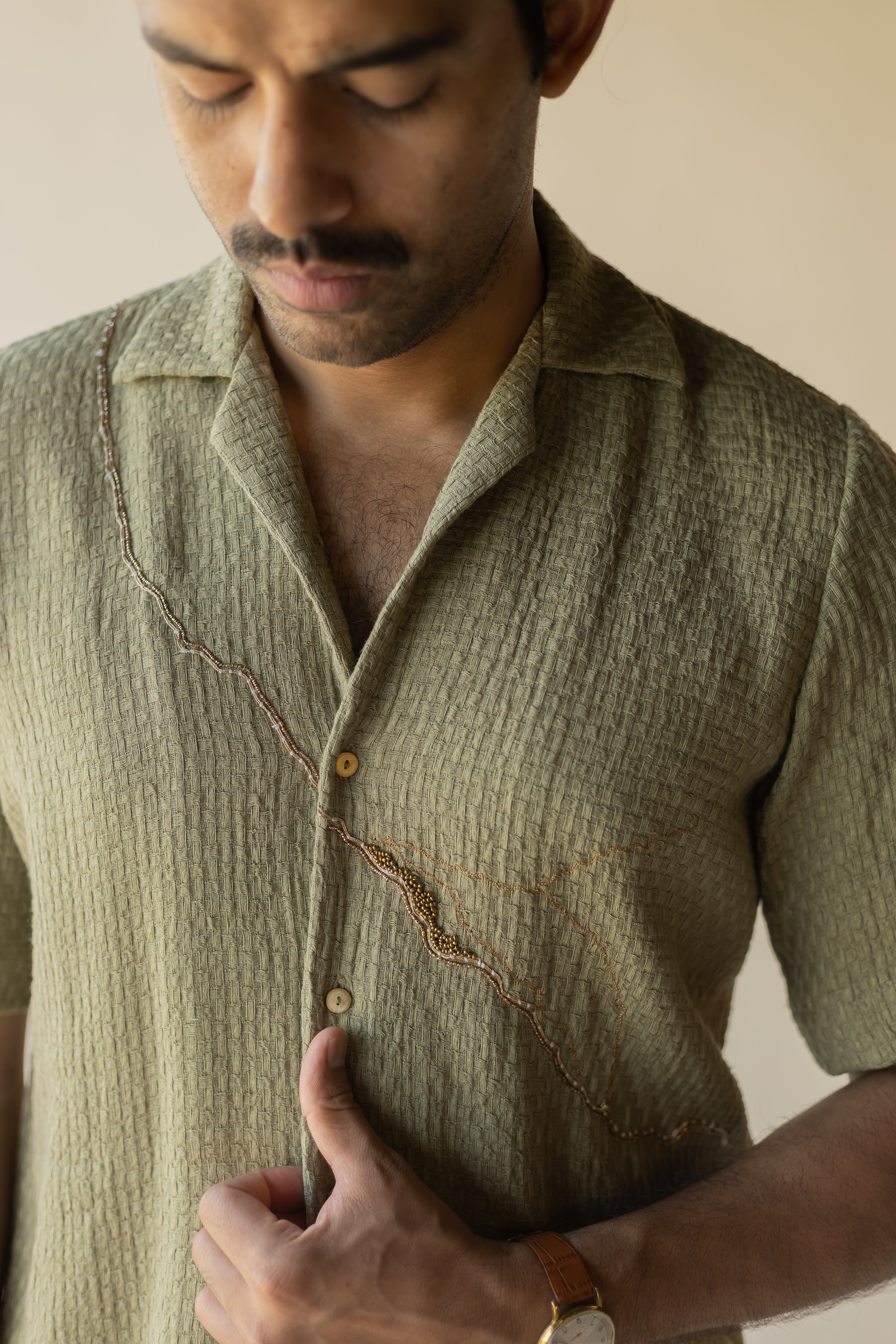 A classic shirt crafted in textured cotton. Features a tennis collar, embellished with an artistic crack pattern all over with antique wire and beadwork. Highlighted by dull gold brass buttons.